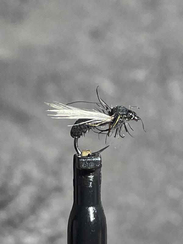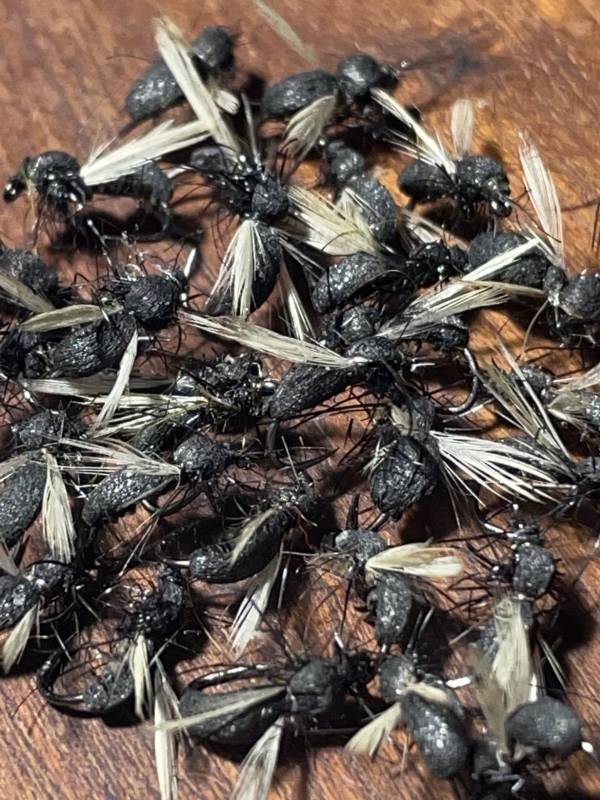 Les retombées de fourmis (ailées) sont présentes sur les rivières de juin à octobre ,notamment par temps orageux et pluvieux, elles restent indispensables dans vos boîtes...Montées sur des hameçons de 16 et18 , l'abdomen en herl de grande plume et faom, les ailes en pointe d'hackle crème et thorax en substituent de phoque, flotte bien et pêche dans la pellicule....