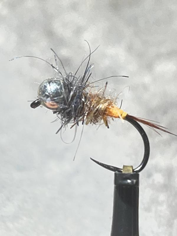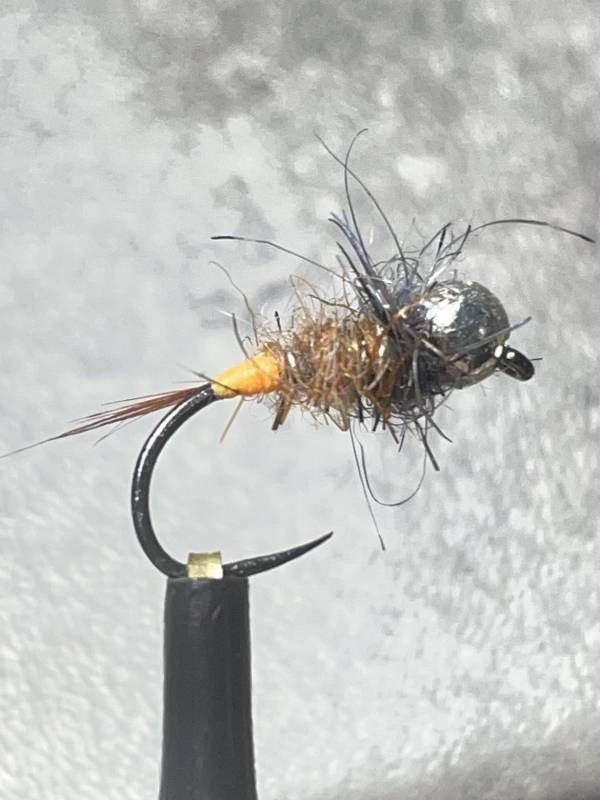 L' Y15 est nymphe qui marche toute la saison avec sa combinaison de couleur, elle est montée sur hameçon fort de fer son tag orange clair, un dubbing maison et cerclé de fil d'argent son thorax gris et tête bille tungstène argent utilisation également pour la nymphe au toc..