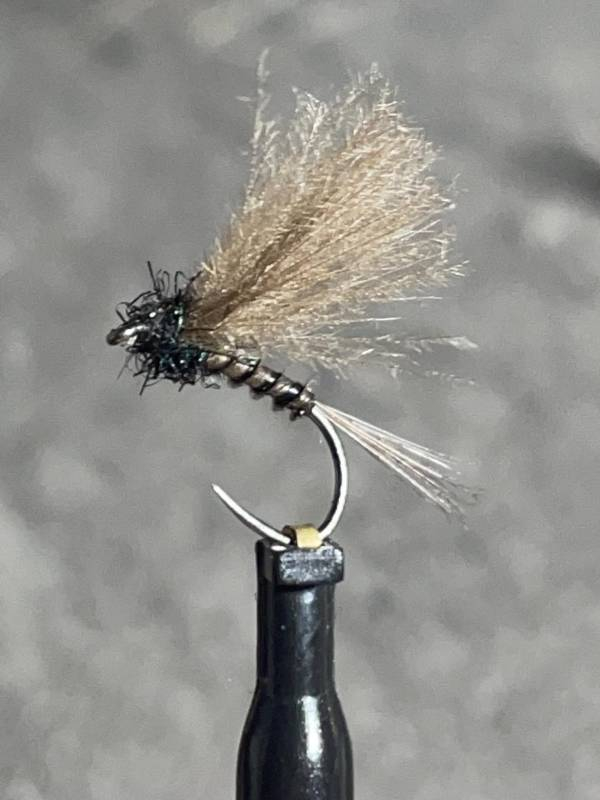 Mouche montée sur une hameçon de qualité sans ardillon, corps en substitut de condor de couleur noire, cerques en pardo, thorax en spectra et ailes en CDC naturel.