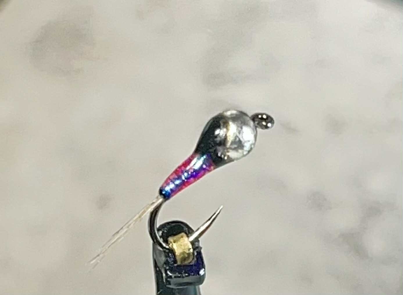 La Mélone ou vitamina, perdigone avec une combinaison pour le corps de couleurs bleu et violet, montée sur un hameçon fort de fer bille argent, marche sur tous types de rivières en Europe, une valeur à ne pas enlever de sa boîte