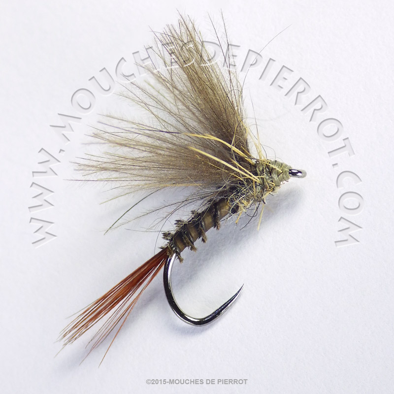 Mouche sèche montée sur un hameçon de qualité sans ardillon, le corps en substitut de condor naturel, cerques en cou de coq roux, thorax en lièvre naturel et ailes en CDC naturel.