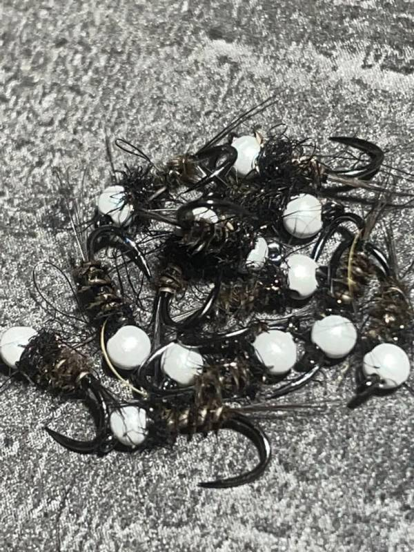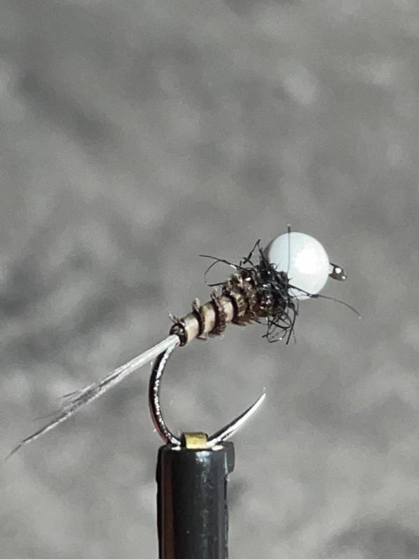 La perle blanche est une nymphe montée sur Hameçon fort de fer,le corps en substitue de condor, thorax noir, et une bille tête blanche, marche sur toutes les rivières à ombre et truite efficace sur les rivières de couleur thé et type calcaire