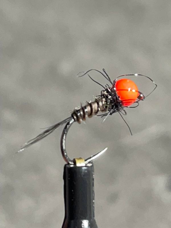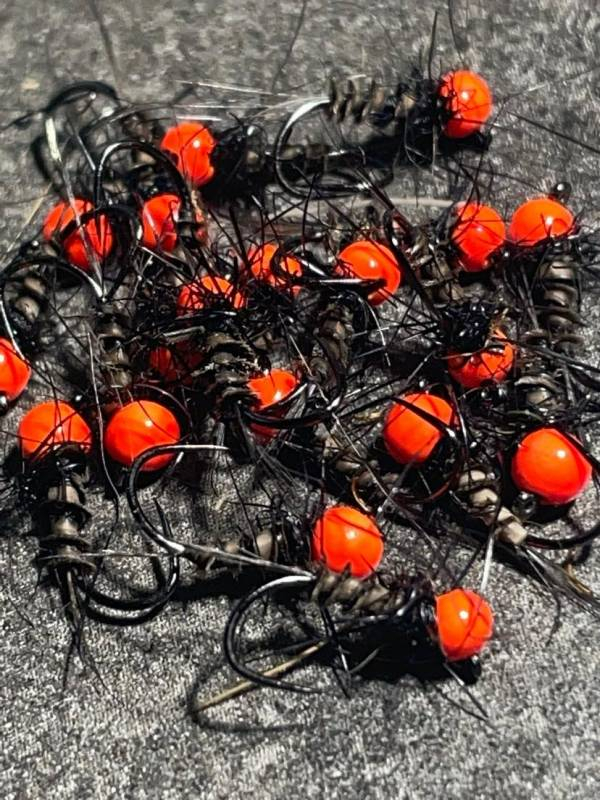 La perle orange est une nymphe montée sur hameçon fort de fer; le corps en herl substitue condor, thorax noir substitue de phoque, et une bille tete orange, marche sur toutes les rivières à ombre et truite efficace sur les rivières de couleur thé et type calcaire ,en eaux troubles sur les bordures...