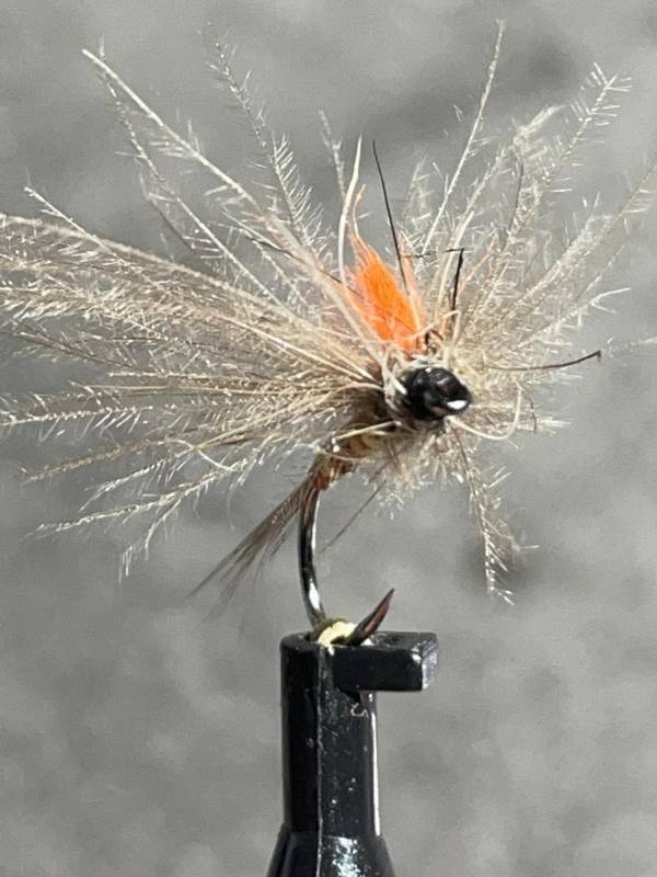 La Pirinenca est une imitation de baetis rhodani, issus des régions d'Espagne son corps en fil de montage marron cerclé de jaune avec un hameçon , son thorax en lièvre, les ailes en V en cdc avec son visualiseur orange, une mouche qui se voit de loin, une mouche d'une grande efficacité...même sur les rivières francaises !!