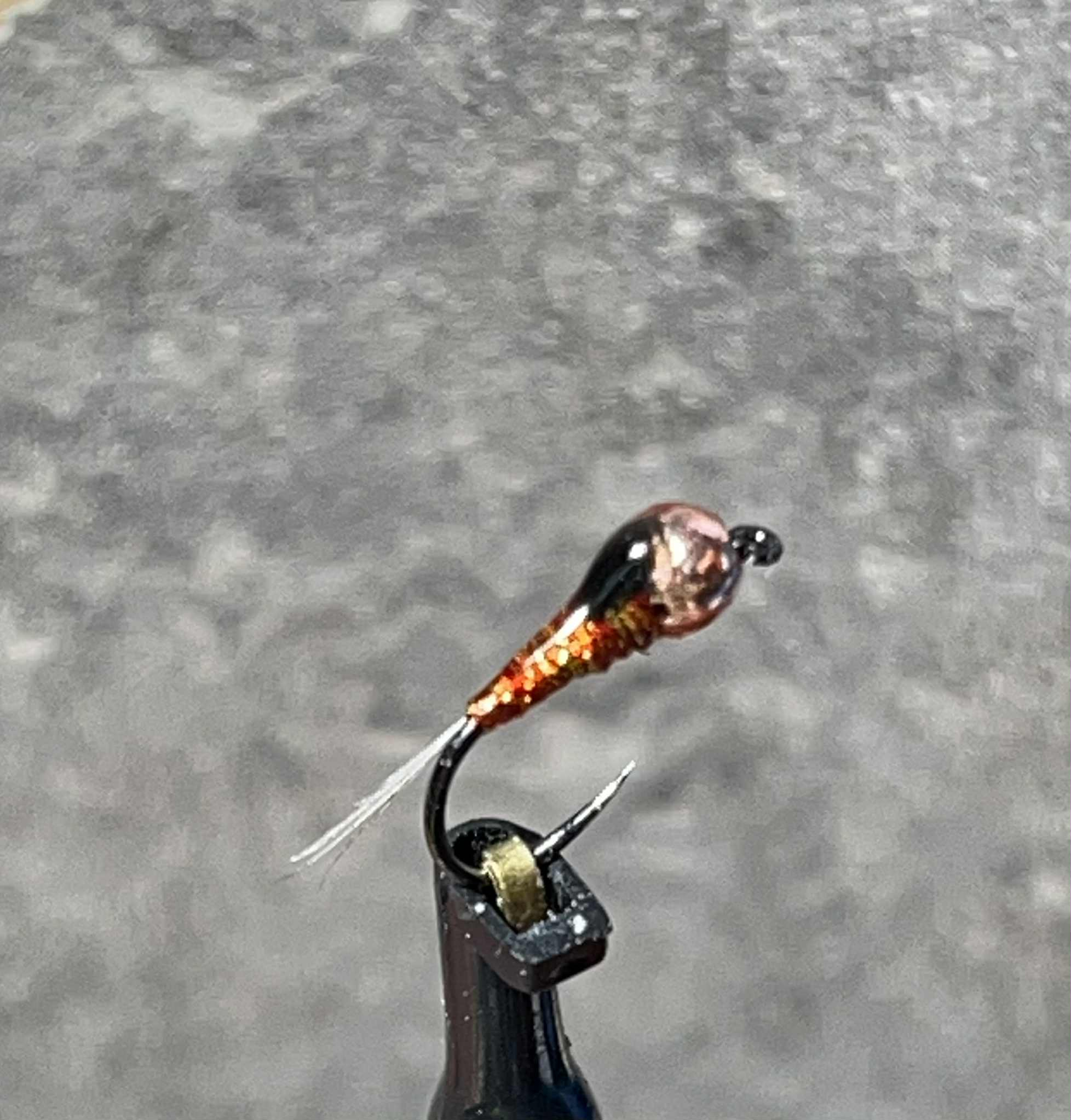Nymphe orange et or, spécialité du sud, c'est pour moi la sucrerie des poissons, truites et ombres. Je la combine avec la Rouge, la Bleu roi et la Goutte d'eau. Elle prend tout au long de la saison sans problèmes.une valeur sur!!