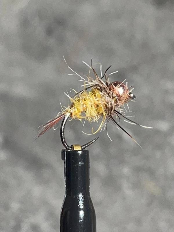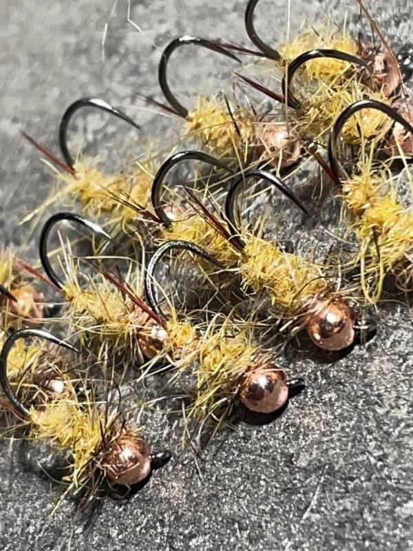 La Trico est nymphe trichoptère montée sur Hameçon fort de fer, avec un mélange dubbing pour donner une couleur jaune sale, le thorax dubbing de substitut de phoque sur un hameçon fort de fer cerclé de fil de cuivre et une bille en cuivre bonne nymphe qui évolue dans les courants ....