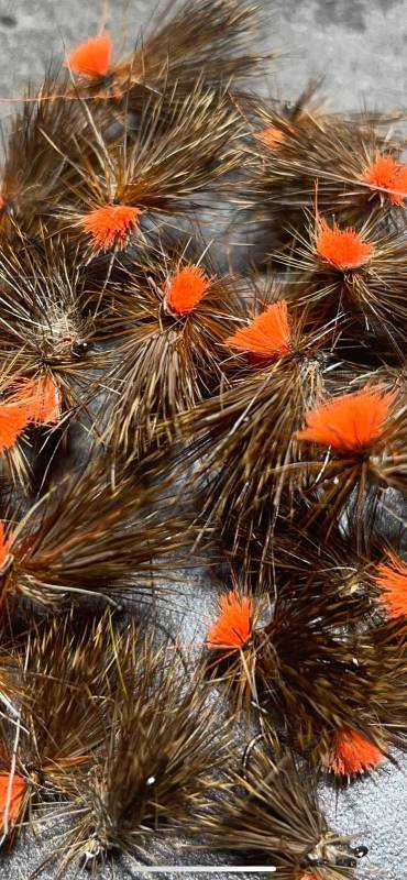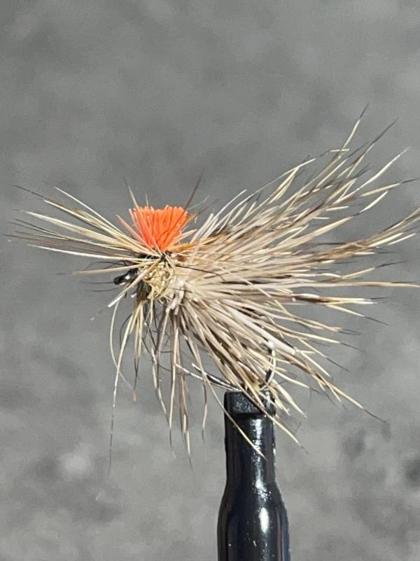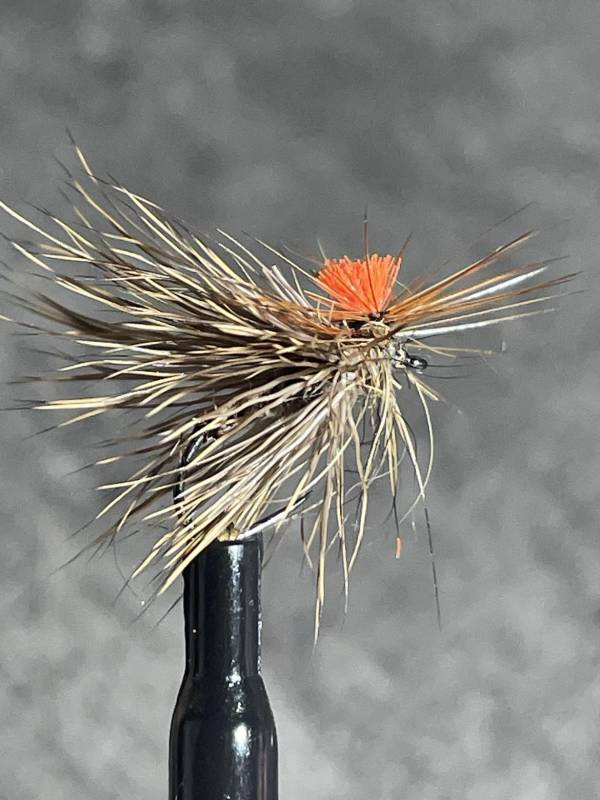 Mouche montée sur un hameçon sans ardillon de haute qualité, corps en herl de grande plume .collorette de cervidé,coq roux en hacles, toupet pour la visualisation orange ( yarrn ), thorax en lièvre naturel.