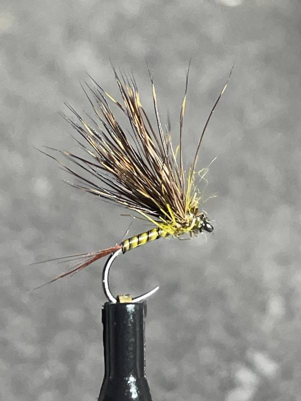 Mouche sèche montée sur un hameçon de qualité sans ardillon, le corps en quill de paon couleur olive, cerques en cou de coq roux, thorax en lièvre naturel et ailes en cervidé naturel.