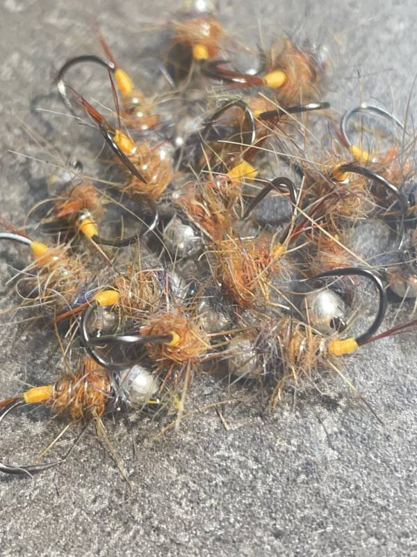 L' Y15 est nymphe qui marche toute la saison avec sa combinaison de couleur, elle est montée sur hameçon fort de fer son tag orange clair, un dubbing maison et cerclé de fil d'argent son thorax gris et tête bille tungstène argent utilisation également pour la nymphe au toc..
