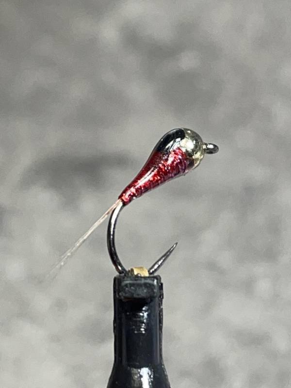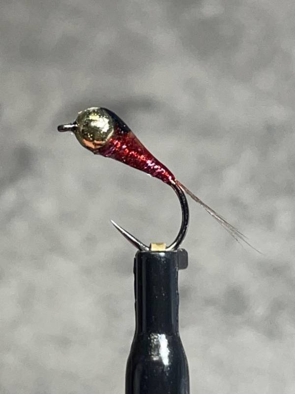 Perdigone rouge et rose, montée sur le hameçon fort de fer . Bille or, à utiliser sur des rivières à ombres et truites, moins brillante, plus sobre et qui peut faire la différence, en potence ou en pointe