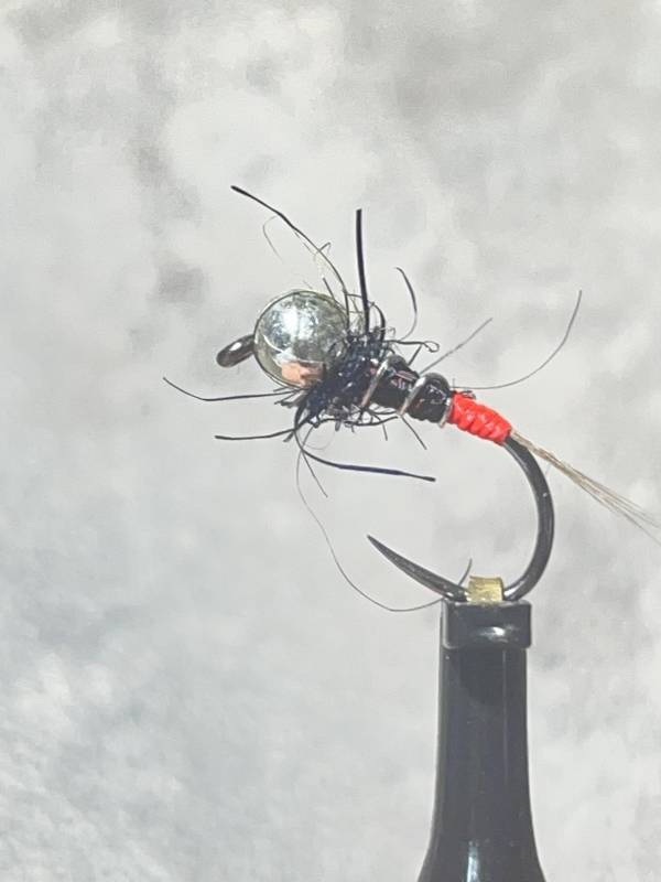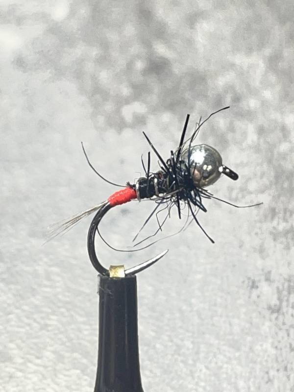Nymphe tag rouge et noire cerclé de fil d'argent et thorax en substitue de phoque noire , montée sur hameçons fort de ferqui a fait ses preuves autant pour la truite que pour l'ombre tout au long de la saison.À avoir dans ses boîtes!